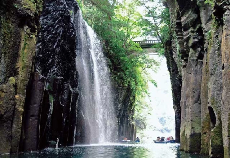 - ★ 高千穂峡のシンボルといえばこちら。手漕ぎボートで近くまで行って、高さ約17mの滝の大迫力を感じましょう。エメラルドグリーンの水面と滝の音、滝に差し込む光に包まれて、異世界に行ったかのような気分が味わえますよ