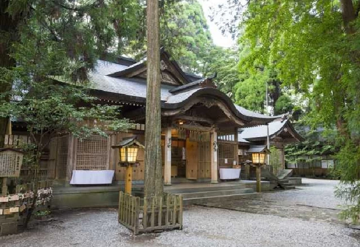 創建は1900年前と伝わる古社。高千穂郷八十八社の総社として信仰を集め、縁結びの神様としても知られる。老木に囲まれた神域に本殿、拝殿、神楽殿が建ち並び、厳かな雰囲気。本殿に施された彫刻や夫婦杉、祈ると悩みが鎮められるという鎮石(しずめいし)なども必見。