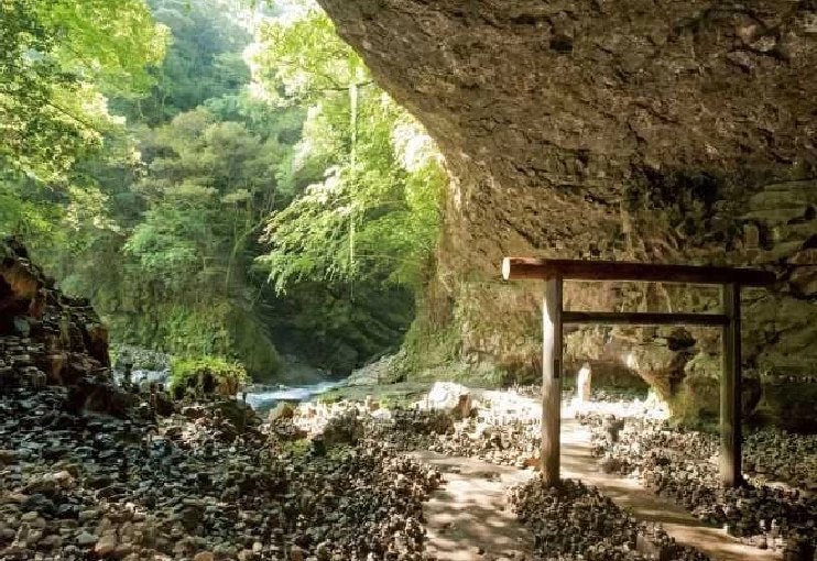 - ★ 天照大神が身を隠したといわれる洞窟には、また閉じこもってしまわないようにと、七五三縄(しめなわ)が張られています。「七五三縄」とは、縄の下に右から七本、五本、三本のワラを垂らす形式のしめ縄のこと。そんなしめ縄発祥の地で「天岩戸神話」の歴史を学びながら、幻想的な雰囲気を味わいましょう