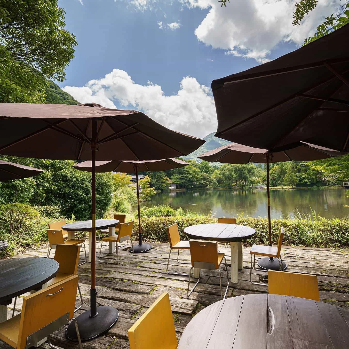 - ★ カフェのテラス席では、金鱗湖を間近に眺めながら食事が楽しめますよ。天然酵母の自家製クロワッサンとコーヒーは、おすすめの一品です