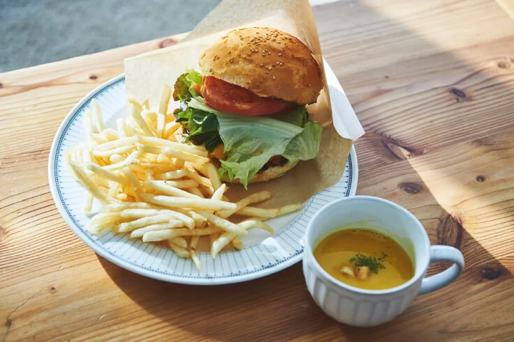 - ★ 地元の食材と作り立てにこだわったメニューは、和食やハンバーガー、ピザなど、バラエティ豊か。牛肉100%のジューシーなパティや特注のオリジナルバンズで作るハンバーガーは、コクのあるソースが後を引くおいしさです。セットには、スープと岩内海洋深層水の塩を使ったフライドポテトが付き、ボリューム満点です