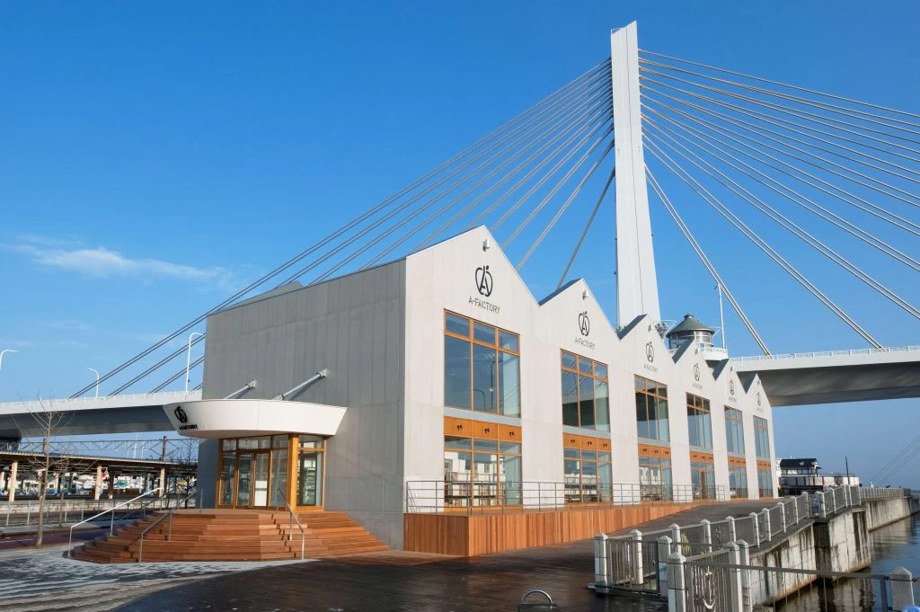 青森ベイブリッジのたもとにある商業施設。六連の三角屋根が印象的な館内には、フードマルシェや銘菓・雑貨店、アップルパイ専門店や県産食材にこだわるレストランなどがずらり。2階にはオリジナルシードルのテイスティングバーも併設。