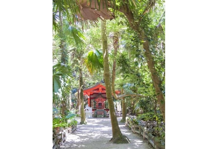 亜熱帯植物に囲まれた小島「青島」の中央に鎮座する神社。神話に登場する彦火火出見命(ひこほほでみのみこと)と豊玉姫命の夫婦を祀ることから、縁結びや安産、航海安全にご利益があるといわれ、境内では若い女性の願かけをする姿が見られる。社殿は鮮やかな朱色で、青い空とのコントラストが美しい。