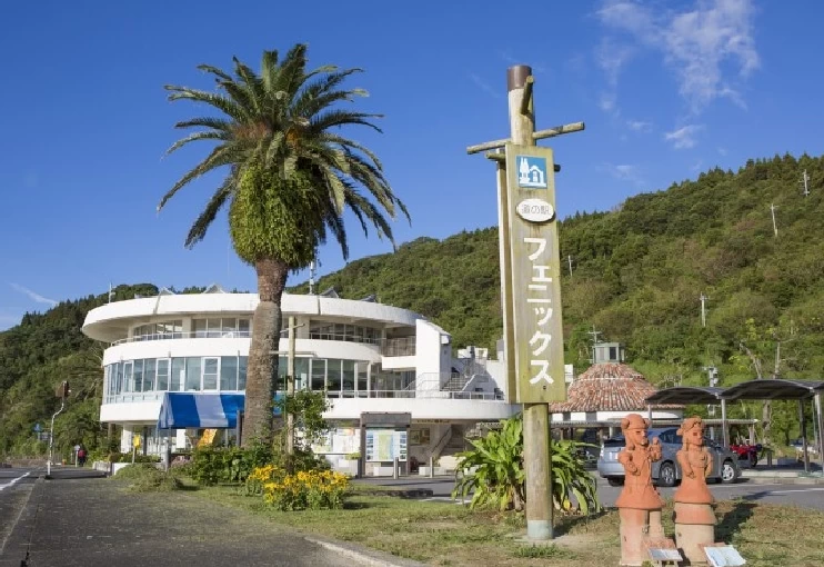 人気のドライブルート、日南フェニックスロード沿いに立つ道の駅。1階は物産館と売店、2階は海が一望できるレストランになっている。ウッドデッキは大海原が見渡せる絶景ポイント。