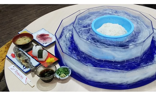- ★ テーブルに設置された回転式流しそうめん台の真ん中に、ザルに盛られたそうめんが運ばれてきます。好きな分だけ取って名水に流しながら、エンタメ感覚で食事をお楽しみください