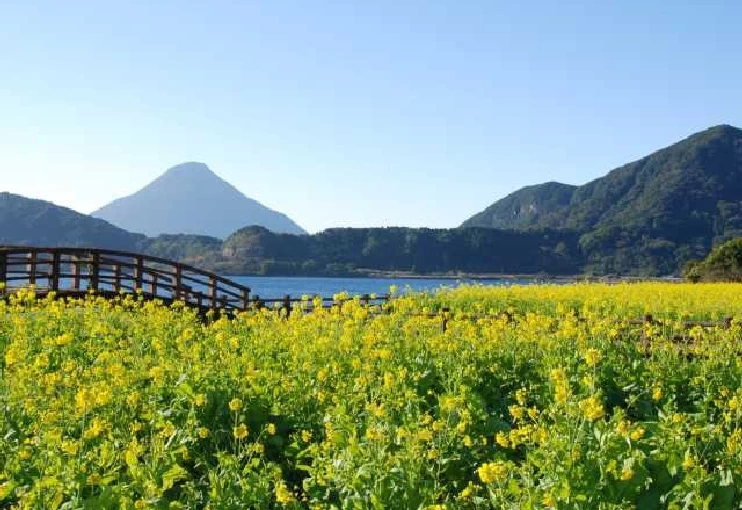 大昔の火山活動によって陥没してできたとされる周囲約15km、最大水深233mのカルデラ湖で、大きさは九州最大を誇る。湖水は藍色に澄み、12月下旬からは菜の花、4月中旬からはポピーやパンジーが湖畔を彩る。