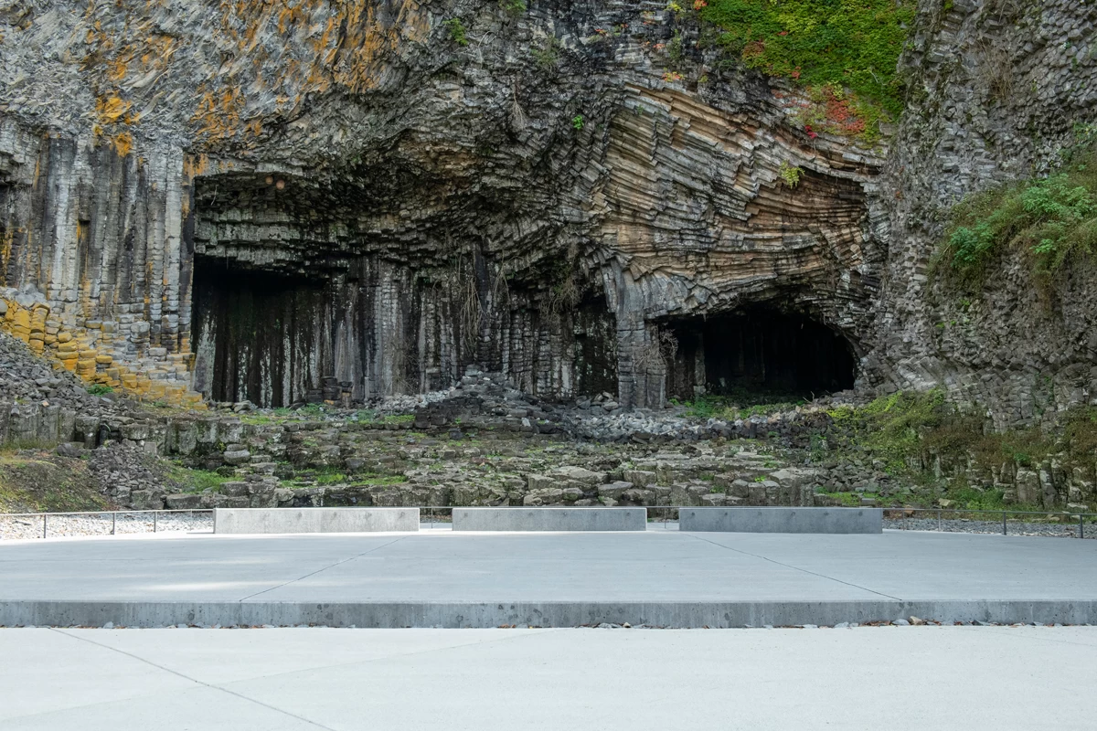 - ★ 起源は約160万年前に流れ出したマグマが、規正しい割れ目を作りながら冷えて固まった「柱状節理」の岩石層です。その後、長い年月をかけて波に洗われ、約6000年前にその姿を地表に現しました。大きさが均一で利用しやすいと多くの岩石が採石されたことで洞が誕生しました。六角形の無数の玄武岩が積み上げられた自然の造形美をぜひご覧ください