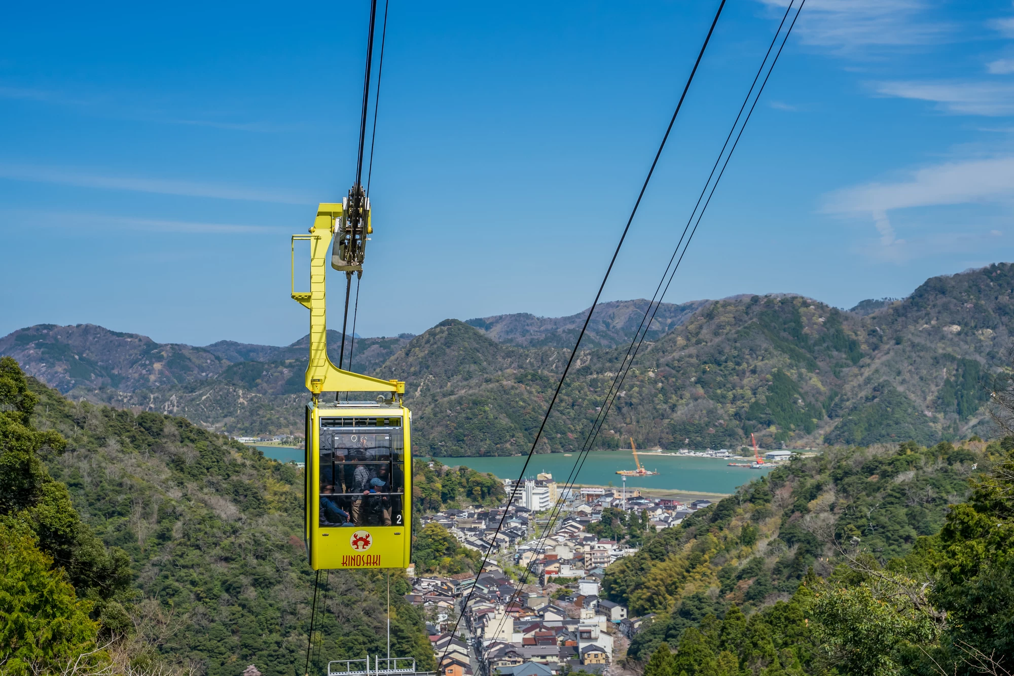 - ★ 城崎温泉の観光名所の一つ「城崎温泉ロープウェイ」。山頂では、眼下に広がる城崎の町並み、そして遠くに日本海の絶景を一望できます