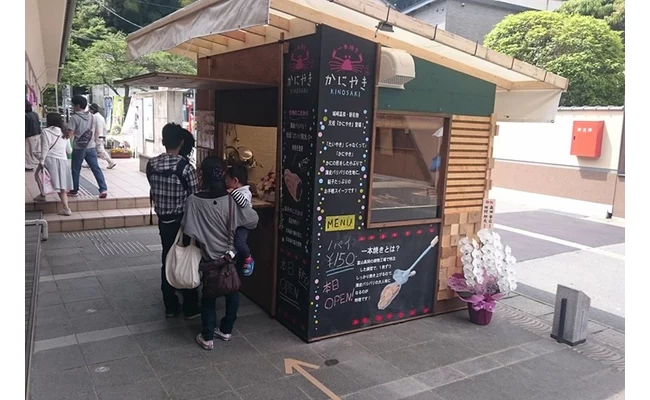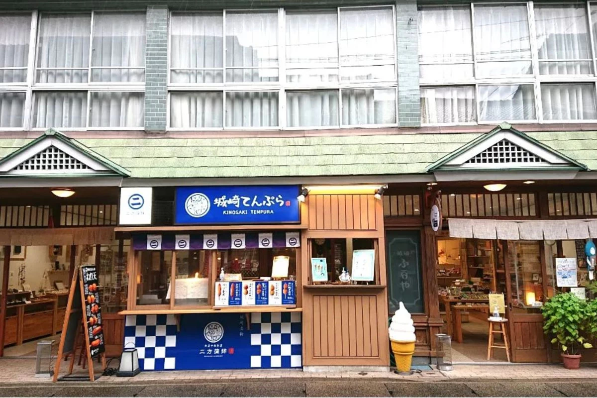 城崎温泉一にぎわう、湯の里通りにある土産物店。店頭では、練り物のてんぷら“ねり天”やソフトクリームを販売する。店内では、城崎銘菓、二方蒲鉾のちくわや蒲鉾などのほか、楽しい雑貨もバラエティ豊かに揃っている。