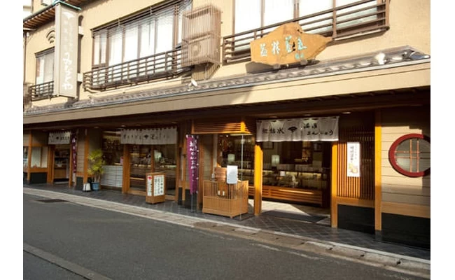 城崎温泉街の中心部にある「御菓子司みなとや」。丹波産大納言小豆、讃岐産和三盆をはじめとする厳選材料を使った菓子のほか、伝統工芸「麦わら細工」や海産物、地酒なども販売している。