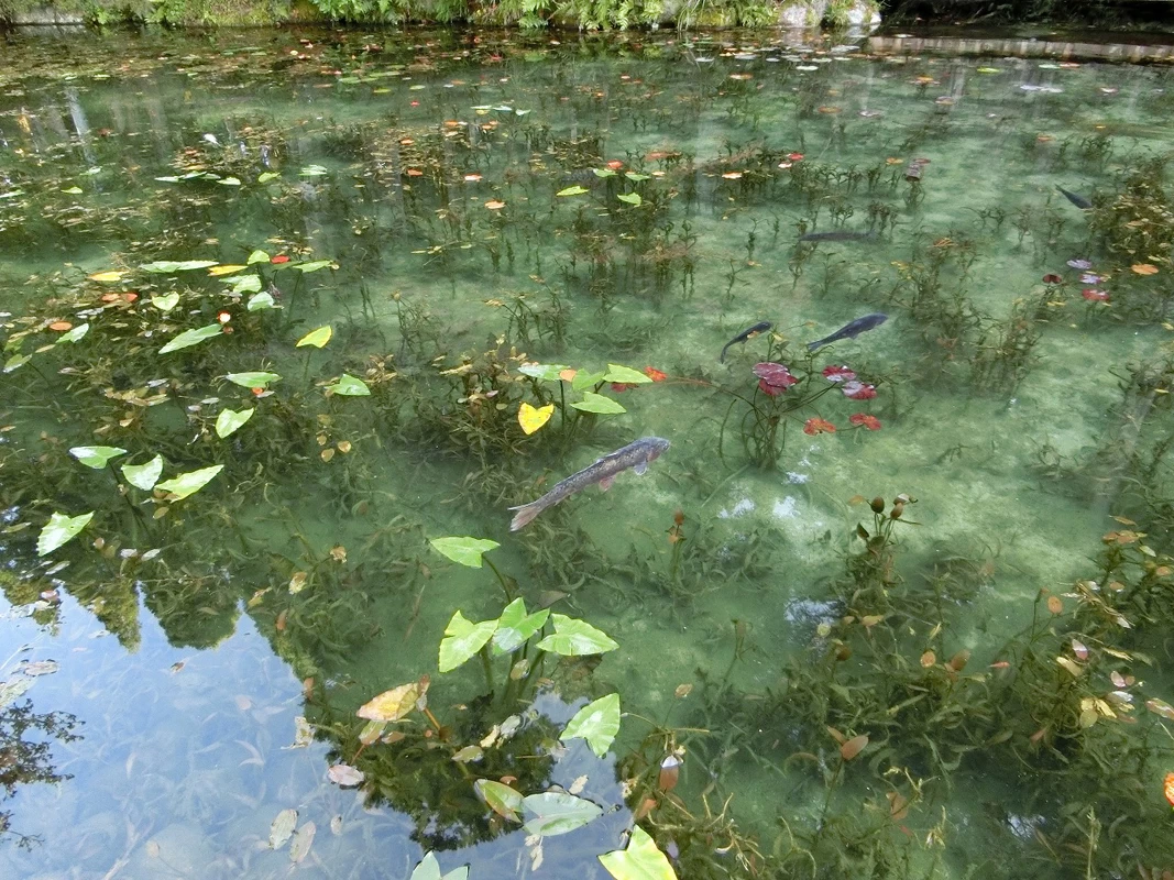 - ★ 透明度の高い湧水の池に、錦鯉や水連の一種コウホネが浮かんでいるかのよう。まさに、クロード・モネの名画を彷彿とさせる絶景です。なお、この水質を守るために、決して鯉にエサはやらないでくださいね