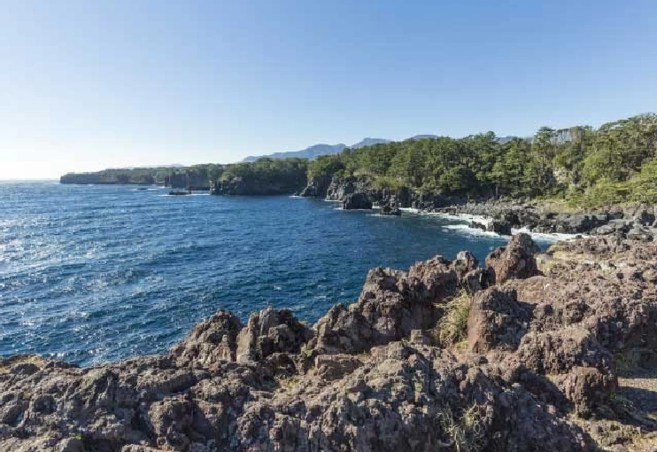 断崖絶壁の岬や入り江が9kmほど続く海岸線。門脇駐車場から歩いてすぐのところにスリル満点の吊り橋が。遊歩道や吊り橋から、紺碧の海や柱状節理の岩壁を満喫したら近くの灯台へ。展望台に上がりぐるりと一周すれば、遠く伊豆七島や天城連山を見渡すことができる。