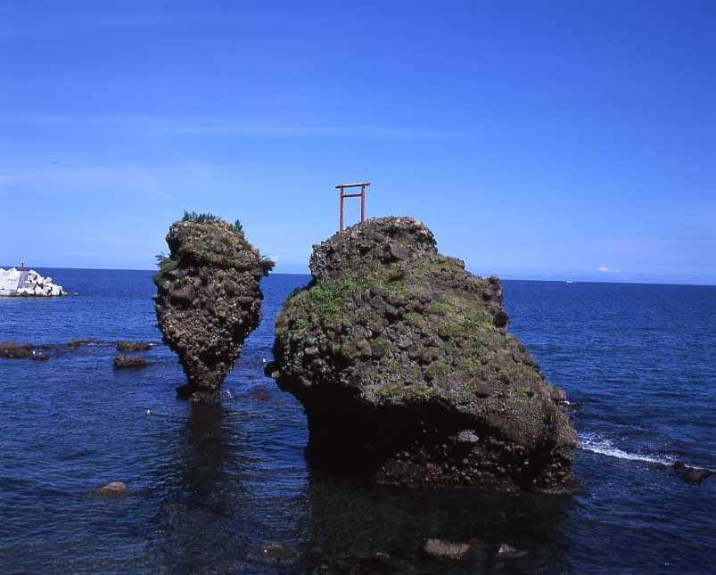- ★ 岩の形や佇まいから夫婦岩(めおといわ)とも呼ばれる二つの岩。ぽきっと折れてしまいそうな不思議な形状の「えびす岩」と、どっしりと佇む「大黒岩」を見ることができます