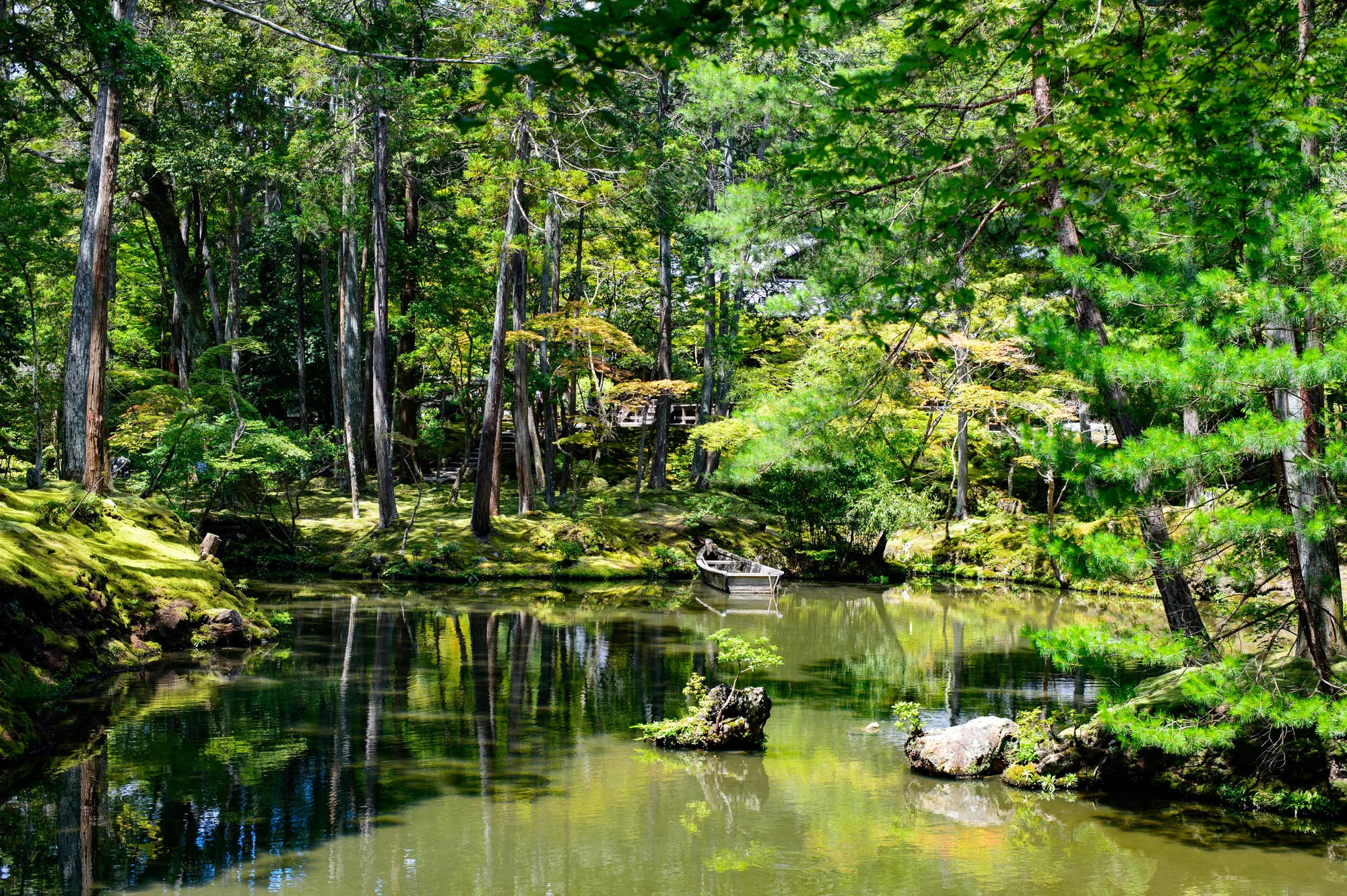- ★ 一面が苔で覆われた緑の世界が広がるため、「苔寺」とも呼ばれる幻想的な寺院「西芳寺(さいほうじ)」。境内には、枯山水の庭と池泉(ちせん)回遊式庭園の2つの庭があり、120余種の苔で覆われた光景は幻想的