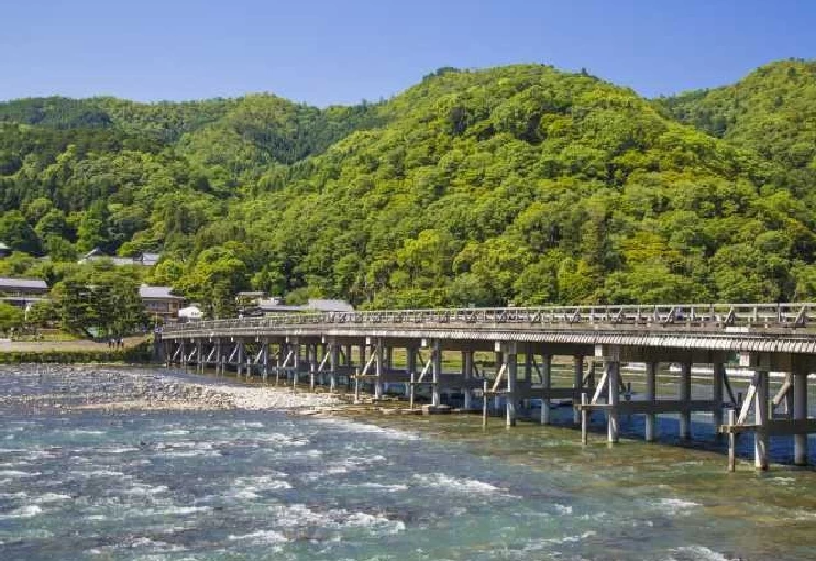 桂川(大堰川)に架かる全長155mの橋。9世紀前半にはすでに存在していたといわれている。橋の歴史は古く、平安時代中期の承和年間に道昌(どうしょう)という僧がかけたものが最初。亀山上皇が橋の上を移動する月を眺め「くまなき月の渡るに似る」と述べたことから渡月橋と名付けられたという。