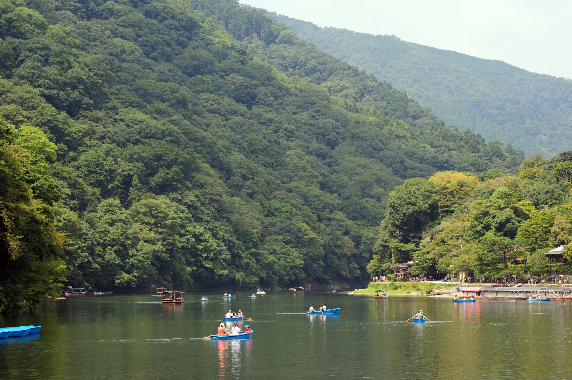 屋形船や手漕ぎのボートで、嵐山の風情が水上から楽しめる。自由に1時間かけて巡れる3人乗りのレンタルボートがおすすめ。屋形船は所要約30分が基本で、見事な渓谷と四季折々の景色が楽しめる。所要約1時間で貸切や食事付きの遊覧船もある。