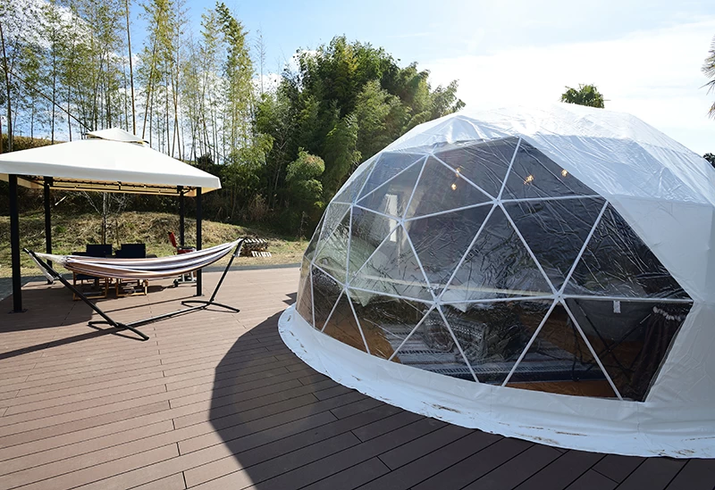- ★ グランピング施設は、ドーム型テントの周囲にハンモック、たき火台などを備えています。昼間は日光浴、そして夜はバーベキューや、たき火を囲んでの談笑などを楽しめます。さらに、本館の温泉を利用できるので、グランピングと温泉を同時に満喫できるのも魅力となっています