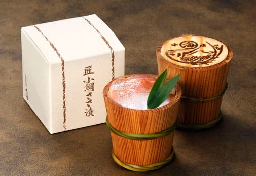 若狭の海から生まれた伝統珍味が揃う海産加工物専門店。淡白な味わいが魅力の「小鯛ささ漬」は、3枚におろしたレンコダイを赤穂の天然塩と地元老舗店が醸造する米酢で調理し、杉の樽に詰めた人気商品。保存料や化学調味料を一切使用しない完全な自然食品で、作業工程はすべて手作り。器となる樽の素材も国産にこだわっている。