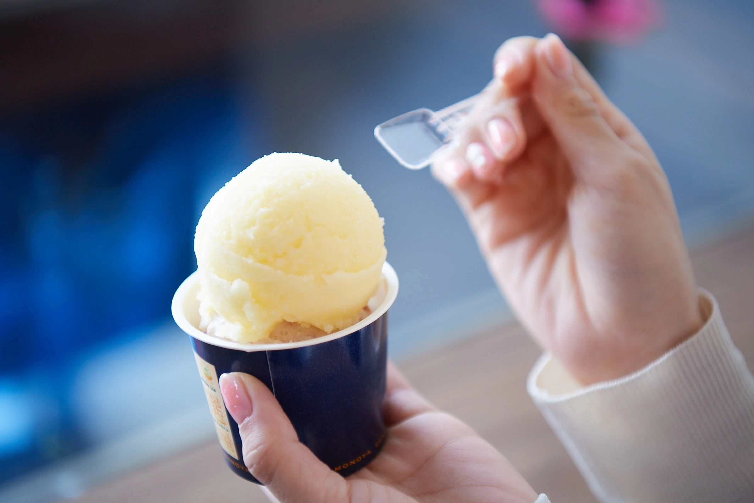 - ★ 和歌山の旬の果物が所狭しと並ぶ店内の一角で、ジェラートをいただくことができます。完熟フルーツをアイスクリームの成分の40%以上と極限まで詰め込んだジェラート(シングル200円、ダブル300円)は、もちろん自社工場製。エキスや合成着色料、香料、保存料は一切不使用。まさに果物そのもののおいしさです