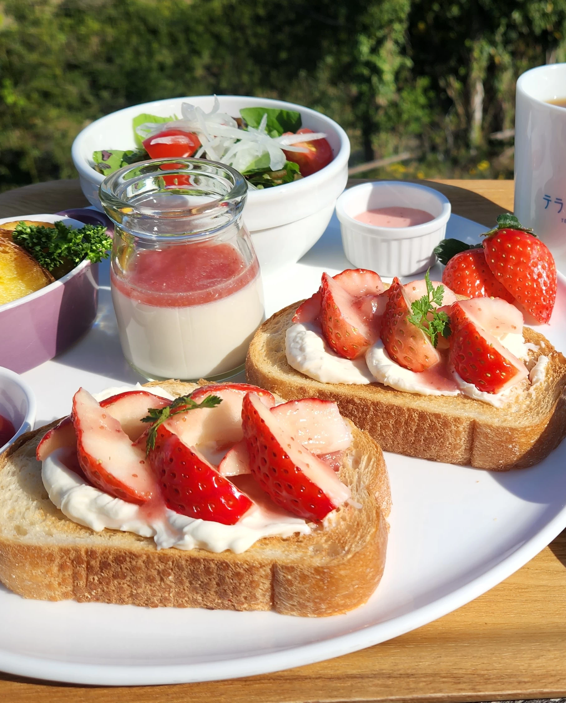 - ★ 自然がいっぱいの展望テラスが大人気の「テラスカフェ空」はランチにもおすすめのスポットです。自社「コモレビ農園」産のいちごを使用したオープンサンドやいちごパフェなど、この施設ならではの味を楽しめるのも魅力です
