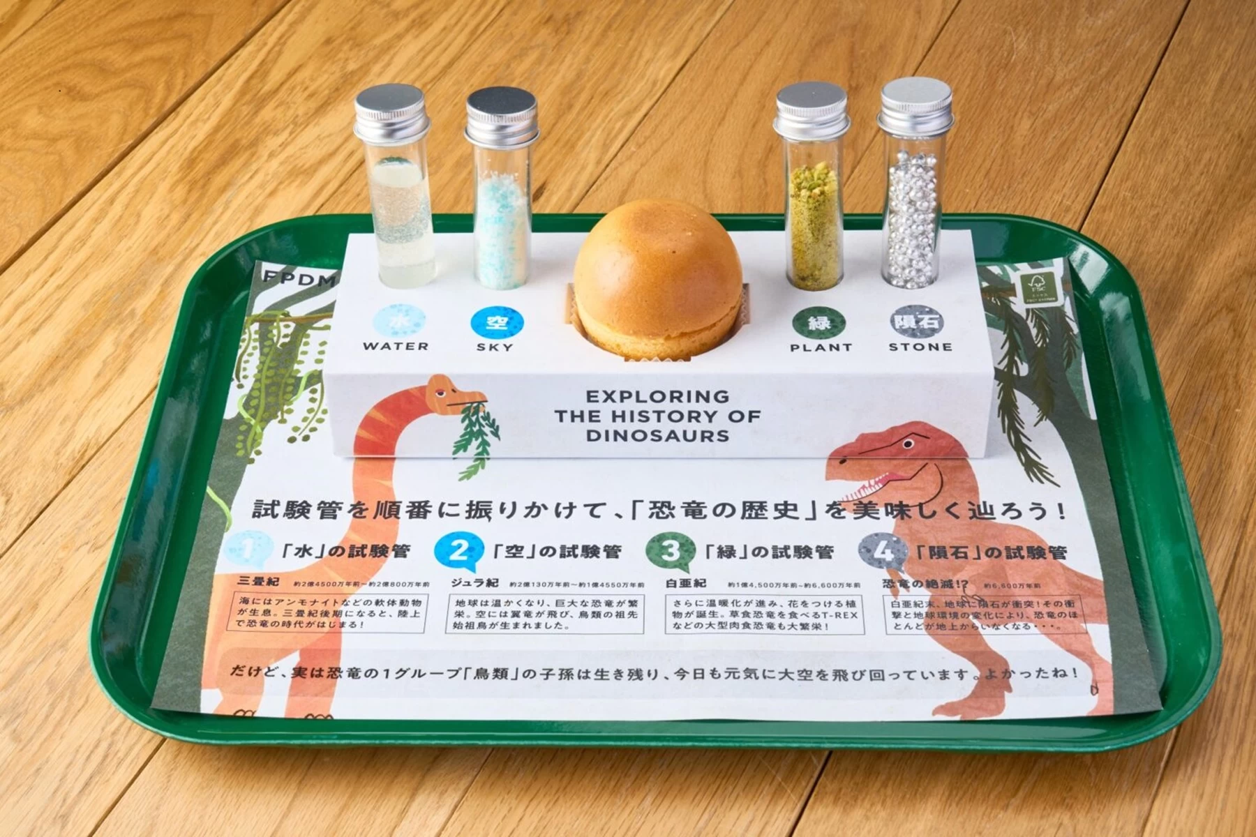 - ★ 「恐竜の歴史をたどるケーキ」はユニークなメニュー。スポンジケーキのそばに、水・空・緑・隕石(いんせき)をイメージした4種類の“試験管”が用意されています。試験官に入った食材を、順番にスポンジケーキに振りかけていくことで、まるで実験のように“味変”を楽しめます