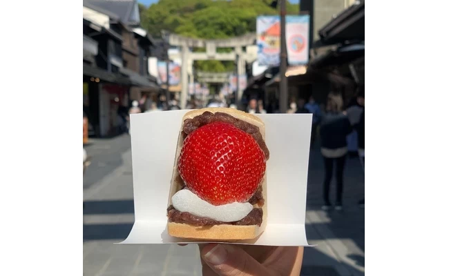 - ★ あまおう苺の中でも特大サイズを使用した「あまおういちご大福最中」。餡の種類は、八女抹茶・白餡・粒餡の3種類。最中は大宰府政庁跡で出土した鬼瓦がモチーフで、インパクト大です。甘酸っぱいあまおうと、甘い餡の組み合わせがたまらない美味しさ!