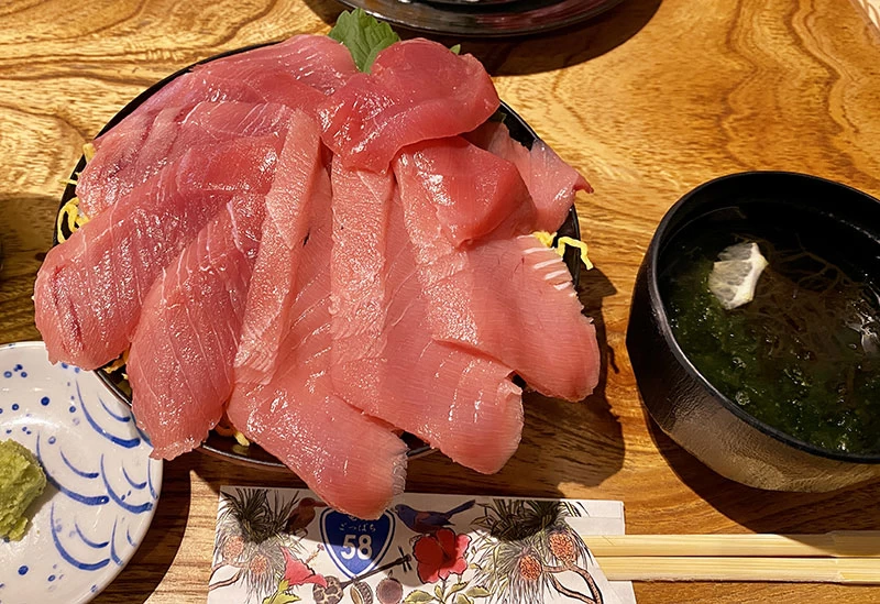 - ★ 旅の初日の締めくくりは、地元で愛される海鮮居酒屋「奄美水産 海鮮ごっぱち」へ。ここの自慢は、何といっても「生の」本マグロです。一本買いしたマグロを店内で解体し、じっくり熟成させてから提供しているため、凝縮された旨みと、とろけるような食感が堪能できます