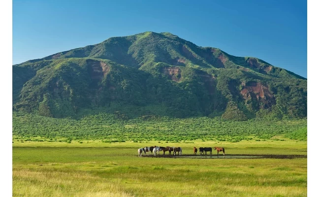 - ★ 噴煙を上げる中岳を望み、絶好のロケーションを誇る草千里(くさせんり)。中央の大きな池や放牧された馬など、どこか牧歌的な風景が広がります。緑鮮やかな自然を見てリフレッシュしてみては?