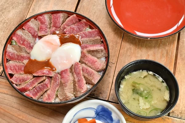 - ★ 阿蘇といえば、あか牛のステーキや薄切りの肉をご飯の上に敷き詰めた「あか牛丼」を思い浮かべる人も多いはず。こちらでは牛丼はもちろん、サーロインステーキも人気。あか牛の美味しさをさまざまなメニューで堪能できますよ