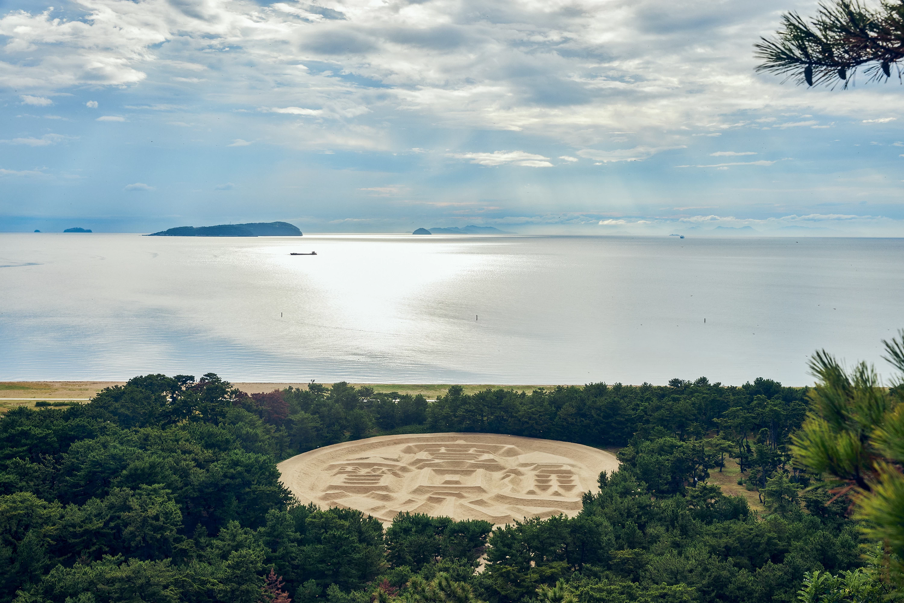 - ★ 砂絵は東西に122m、南北に90m、周囲は345mと巨大で、琴弾山山頂にある銭形展望台から眺めるのがおすすめ。日が傾く午後は、よりきれいに「寛永通宝」の文字が浮かび上がり、日没後は22時までライトアップされて幻想的な雰囲気に包まれます