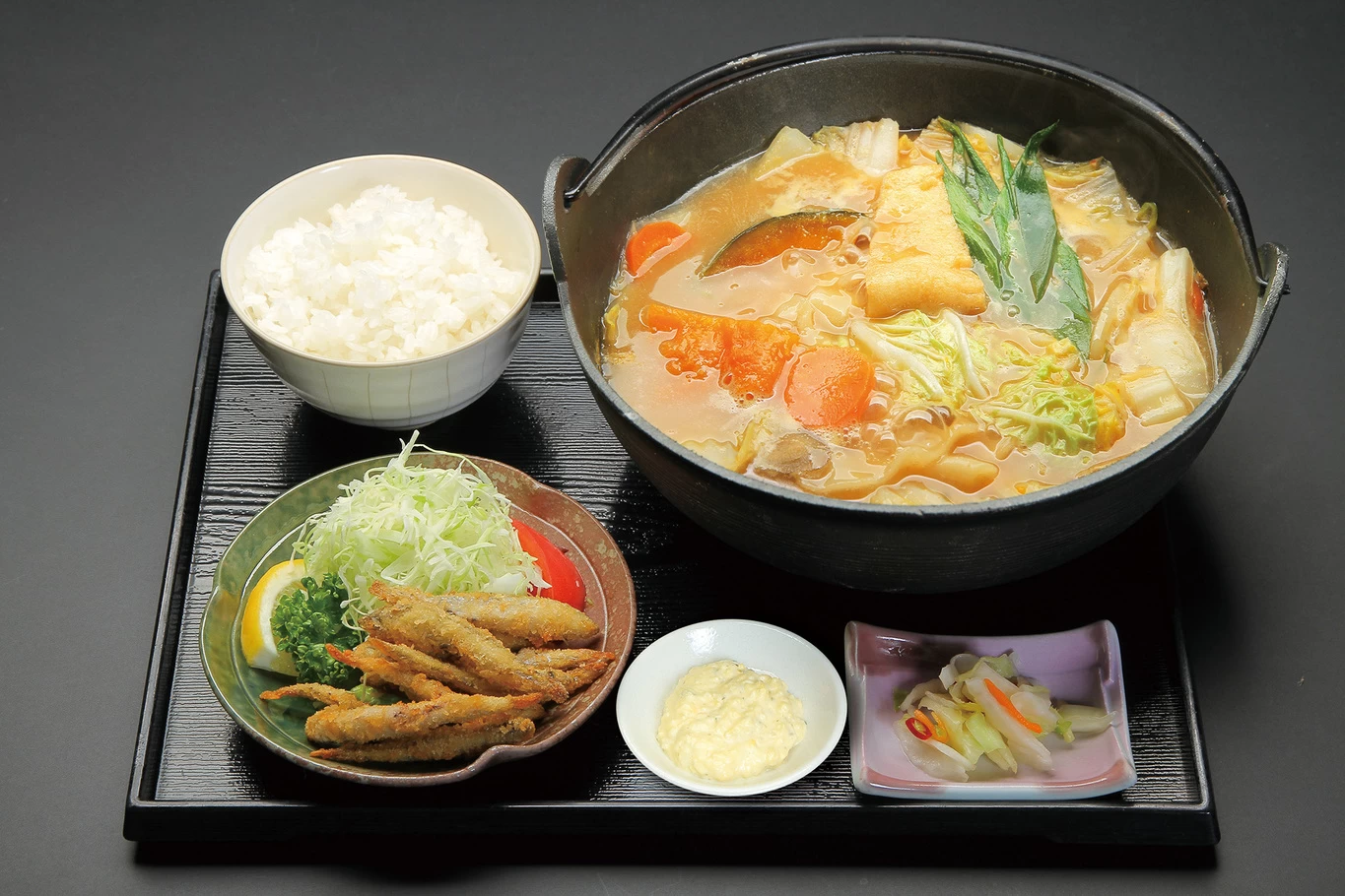 - ★ ほうとうのメニューは、「富士ヶ嶺ポーク」を使用した「豚肉ほうとう」や、まいたけ、なめこ、しいたけをふんだんに使った「きのこほうとう」、ほうとうの定番の「カボチャほうとう」など種類豊富。「カボチャほうとう」、「わかさぎフライ」、ご飯、香物がセットになった「庄ヤセット」もおすすめです