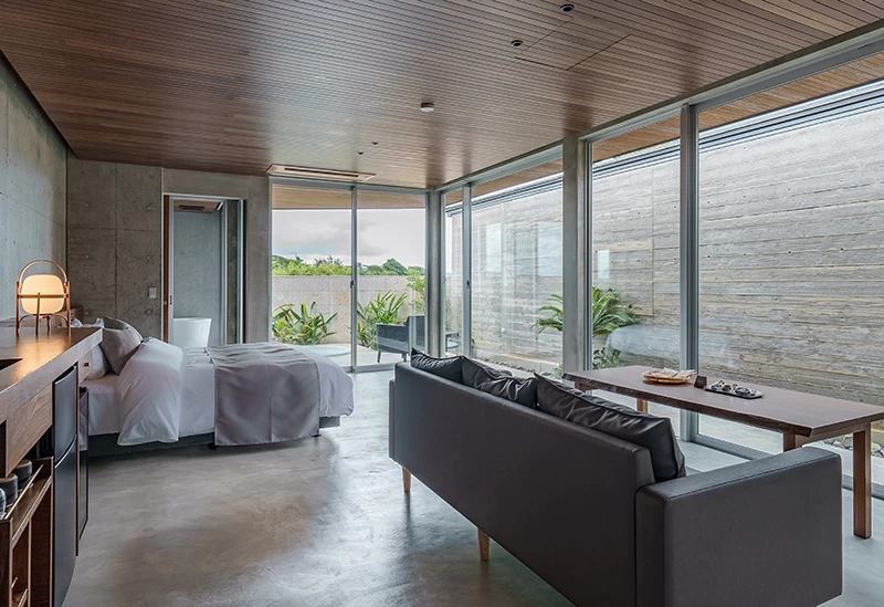 種子島で2023年にリブランドオープンした、露天風呂付きのヴィラタイプのホテル。上質なプライベート空間には、種子島の植物が植えられ、島の風土が存分に味わえる。約48.95平米以上の広々とした4棟のヴィラは、種子島産の木材を使用した家具を配するデザイナーズルームでバルコニーには露天風呂が備わる。