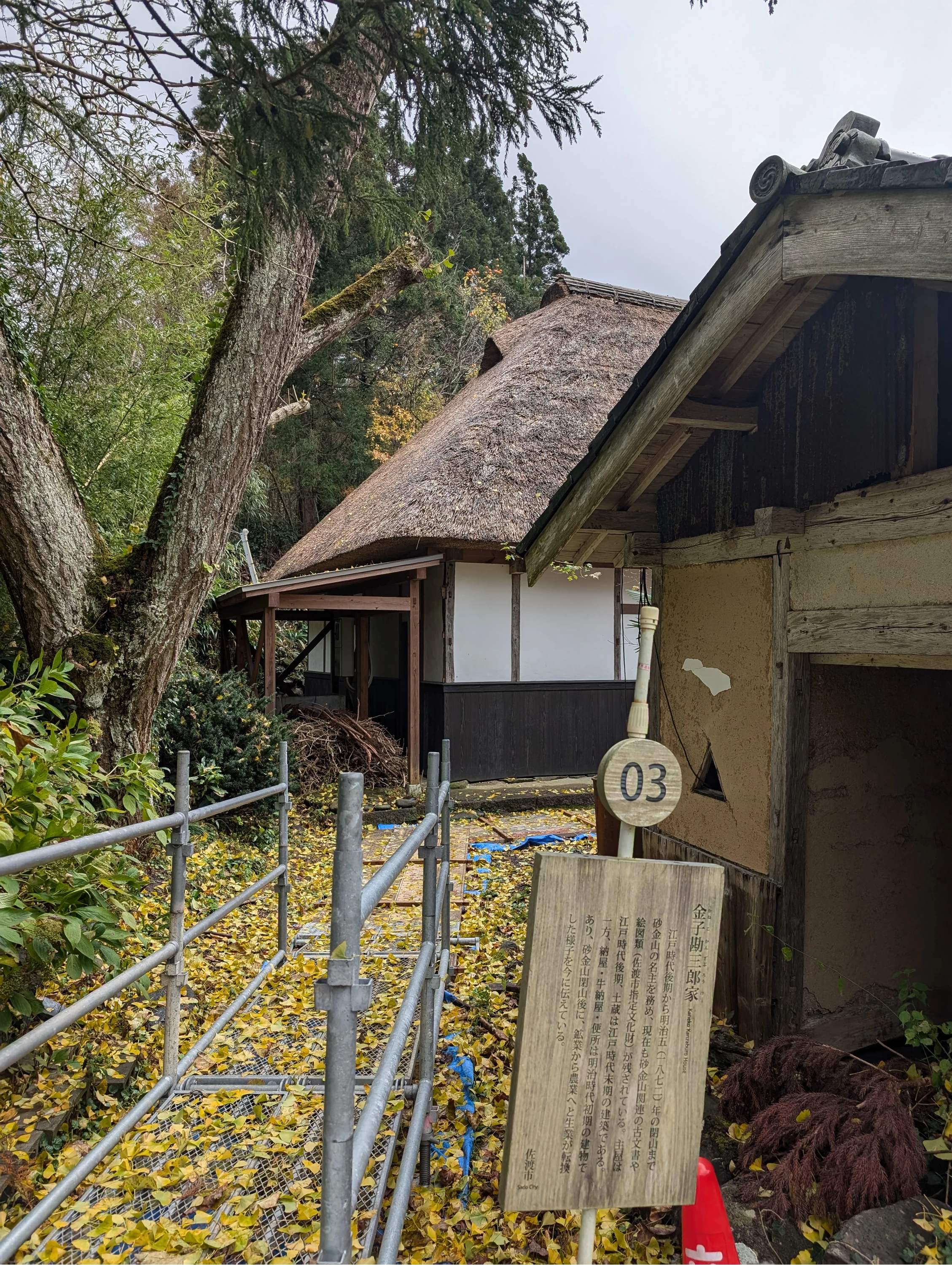 国史跡・国重要文化的景観。江戸時代~1872(明治5)年の閉山まで、砂金山の名主(とりまとめ役)を代々務めた金子家の住宅。19世紀に建てられた茅葺き屋根の主屋のほか、土蔵、納屋、牛納屋などが残っている。