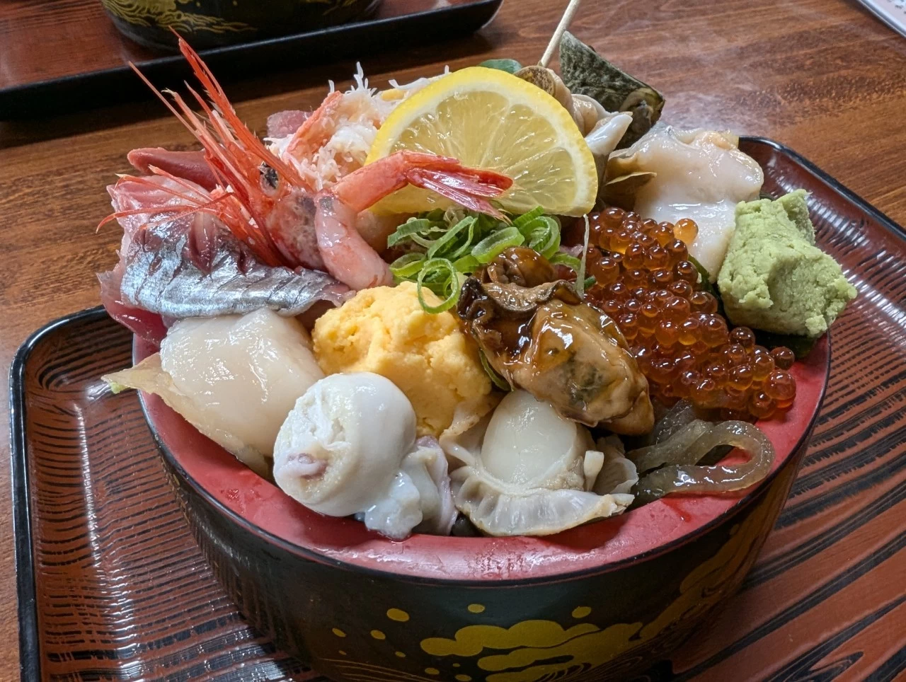 - ★ 人気の海鮮丼の中身は、アジ、甘エビ、貝、マグロ、イカの口など。寿司桶からは、こぼれそうなほどたっぷりの海鮮、玉子、キュウリ、いごねりも乗っています。お腹いっぱいになること間違いなし!
