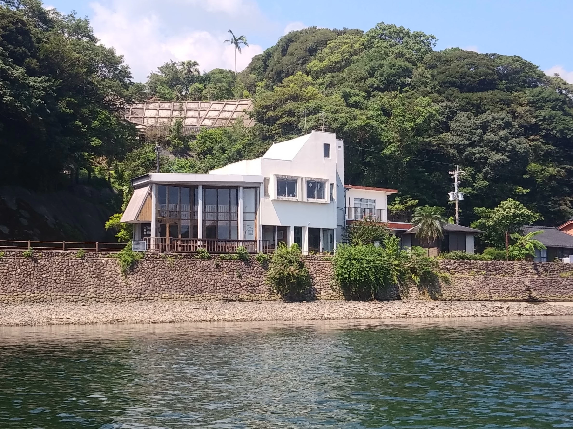 夜の外観。店内からは安房川が見渡せる(現地にて撮影)