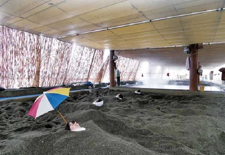 - ★ 葦簀(よしず)に囲われた砂場へ浴衣姿で横たわる。そこにネジリ鉢巻きハッピ姿の係員がスコップで砂を掛けてゆく。温泉を吸った砂はズシリと重い。唯一外界に出している顔から汗が吹き出してくる。砂の中では、お尻に火がついたたよう。たまらず腰を動かそうものなら、できたすき間の空気がさらに熱せられてしまうので注意が必要だ。熱い。熱い──