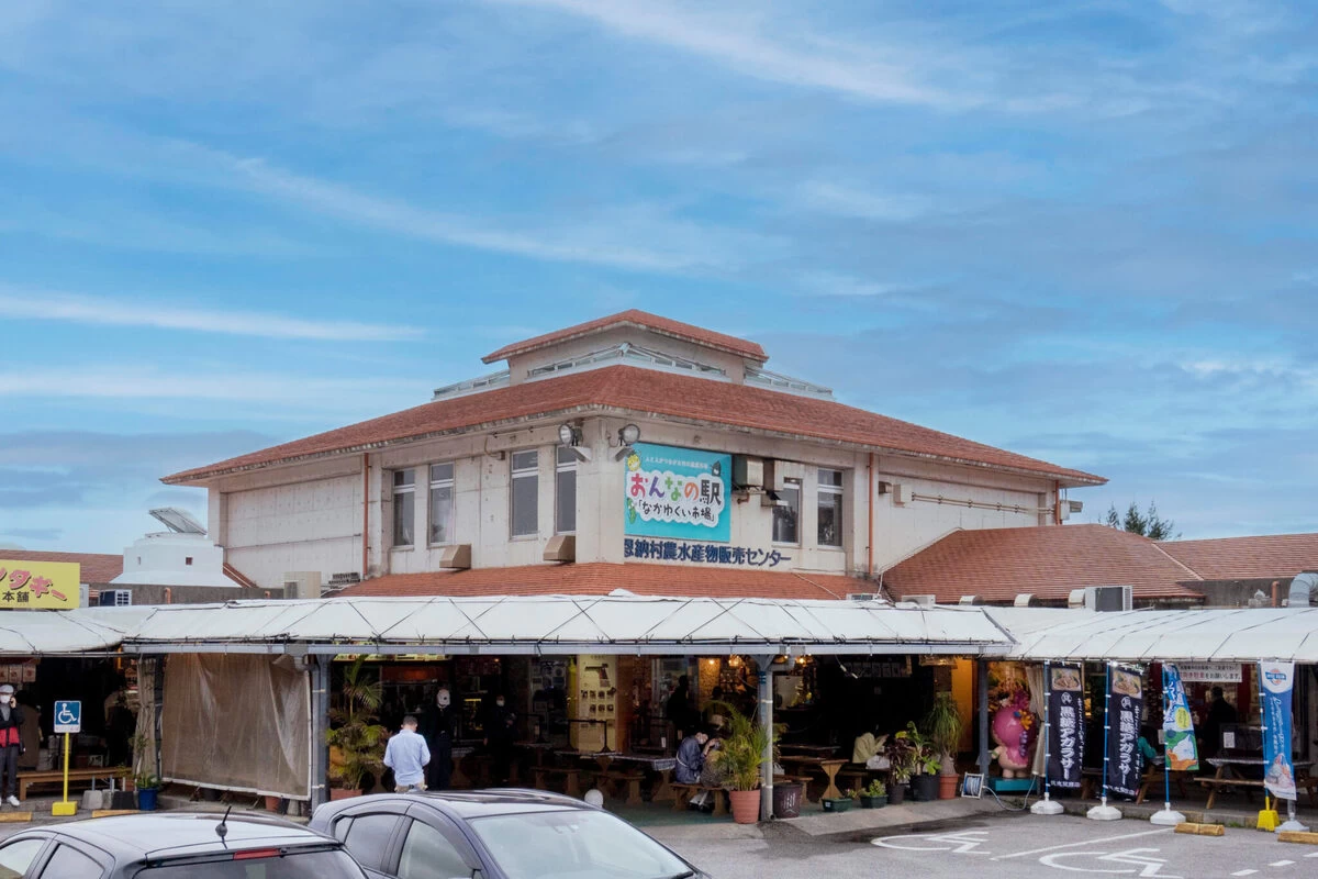 - ★ 地元の新鮮な食材や沖縄ならではのグルメが楽しめる産直市場です。「なかゆくい」とは沖縄の方言で「休憩」を意味し、旅行途中の立ち寄りスポットとして最適です。市場内には約10店舗の屋台型テナントが並び、サーターアンダギーやイカスミジューシーおにぎりなど、沖縄らしい軽食が充実しています