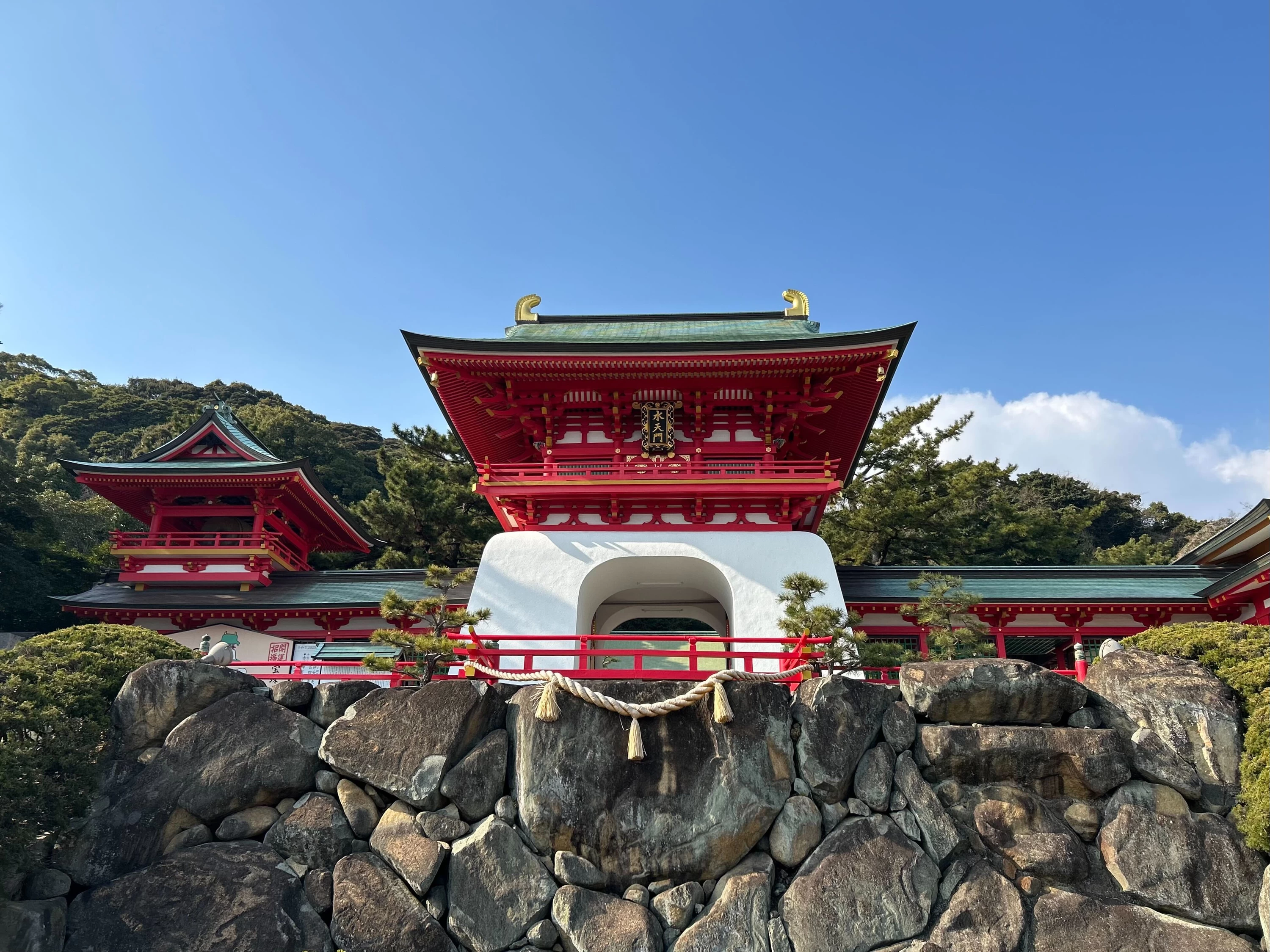 - ★ 地元では「赤間さん」と呼ばれ、地域の人々にも愛されています。本殿は戦火で焼失しており、現在の社殿は昭和15年に再建されたもの。竜宮城のような朱塗りの水天門の佇まいは、晴れた日に見るとひときわ鮮やかで、つい写真に収めたくなります
