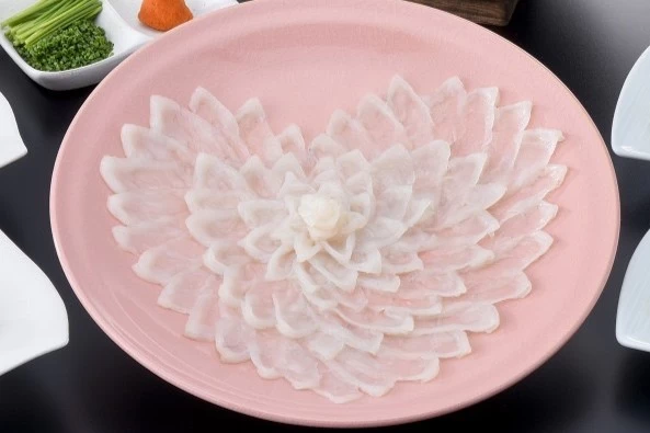 - ★ ピンク色の萩焼のお皿にハート形に盛られたふく恋盛りはカップルやご夫婦の記念日にもおすすめですよ