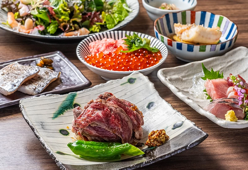 - ★ 備長炭で焼き上げる肉厚でジューシーな「牛ハラミステーキ」や、一口ごとにじっくりとした味わいが広がる「豚の角煮」などの肉料理も揃い、お魚もお肉も味わえます! 旬の味覚とともに心ゆくまで召し上がれ