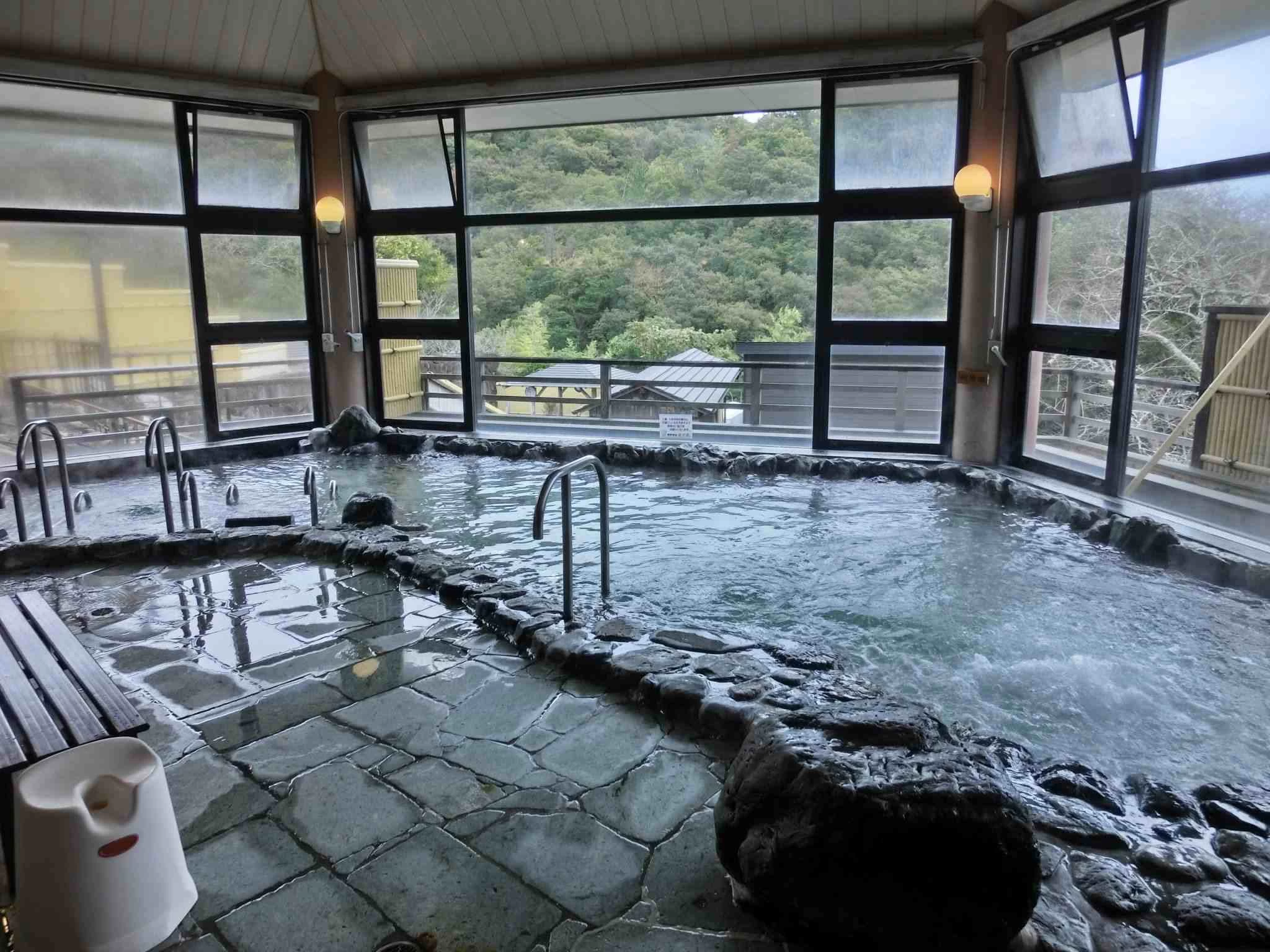 - ★ 地下1,300mより湧くカルシウム・ナトリウムを含んだミネラルいっぱいの塩化物低温泉施設。館内では、絶景を誇る五峰山と景勝・闘竜灘をイメージしており、河原湯や滝風呂、洞窟風呂など、自然に包まれながら存分に天然温泉を楽しめますよ