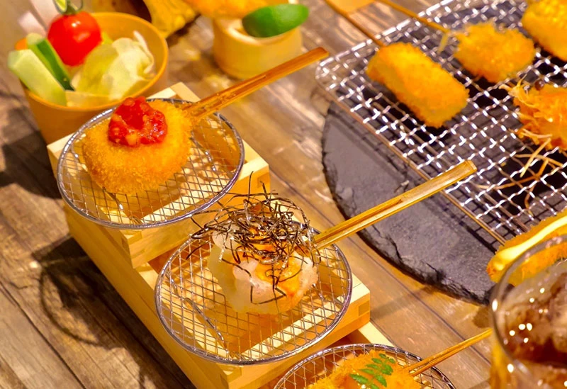 - ★ 定番の串揚げはもちろん、さまざまな変わり種もあるのが魅力。とりわけユニークな「オムライス串」は、オムライスを串で楽しむという斬新な一品。このあとはもう一軒、大阪グルメを味わいに行きますので、食べすぎないようにしてくださいね!