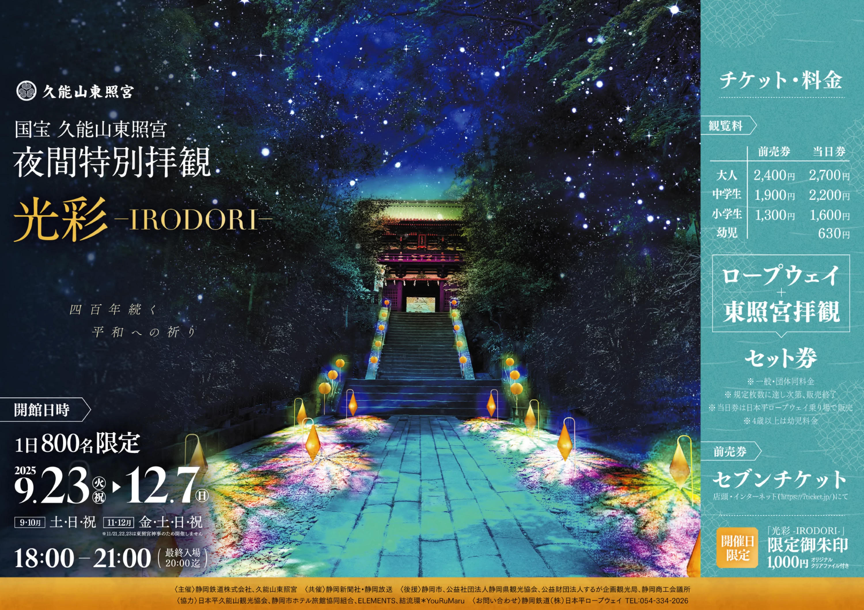 - ★ 久能山東照宮では、9月23日より、2025年秋の夜間特別拝観イベント「光彩-IRODORI-」が開催されます。徳川家康公を祀る国宝の社殿を舞台に、幻想的な装飾が夜の境内を彩る、秋限定のライトアップ企画です。関西を拠点に活動するアーティスト「YouRuMaru(ユルマル)」による折り紙をテーマにした優美なライトアップは、静岡ではめったに見られない演出です。ぜひこの機会にご鑑賞ください