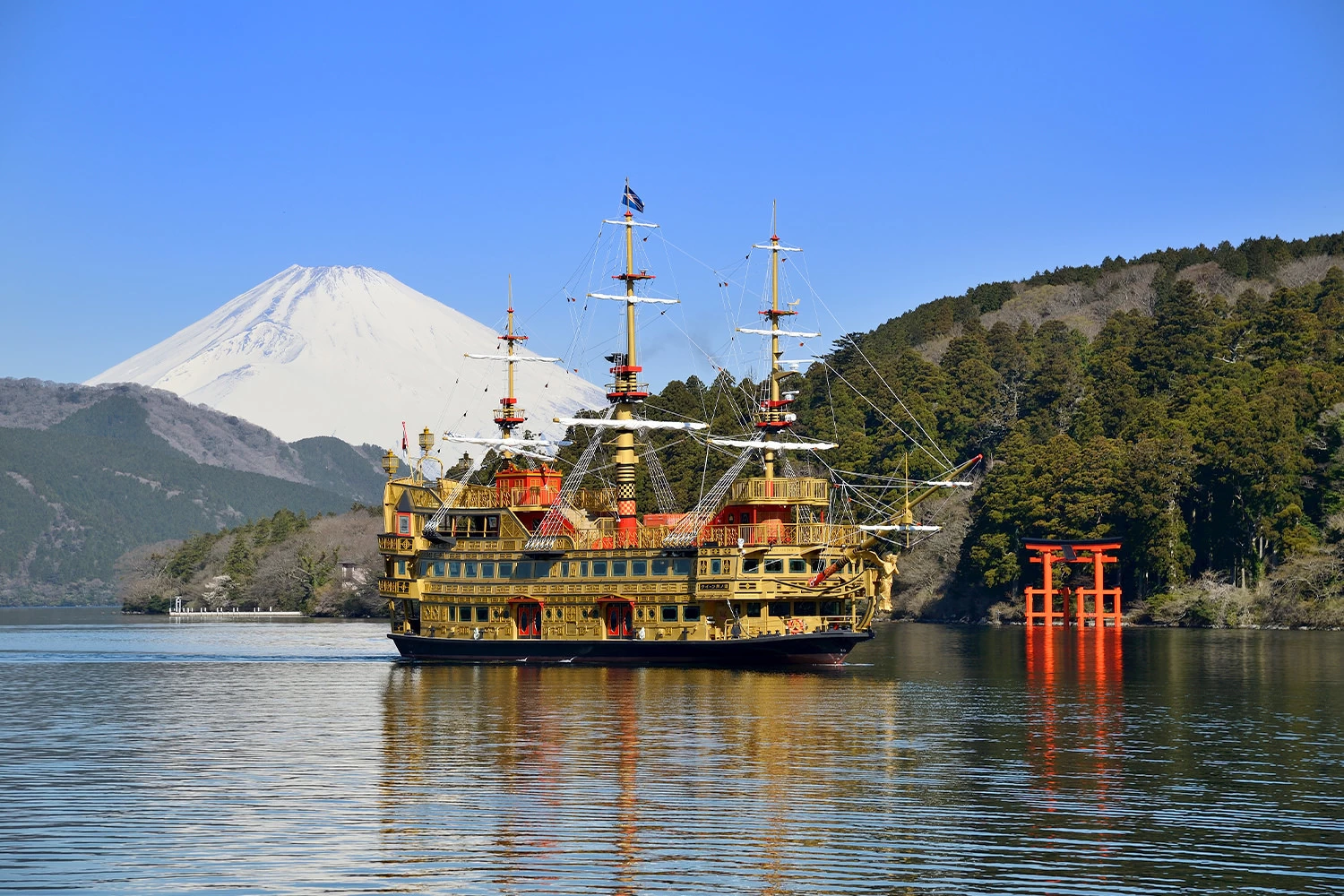 芦ノ湖の3つの港を結ぶ観光船。大自然に佇む富士山を船上から望む絶景が人気だ。2019年4月には「クイーン芦ノ湖」という船が新たに誕生。床から壁や天井まで、木材をふんだんに使った温かみのある船室は、豪華な装いが魅力。