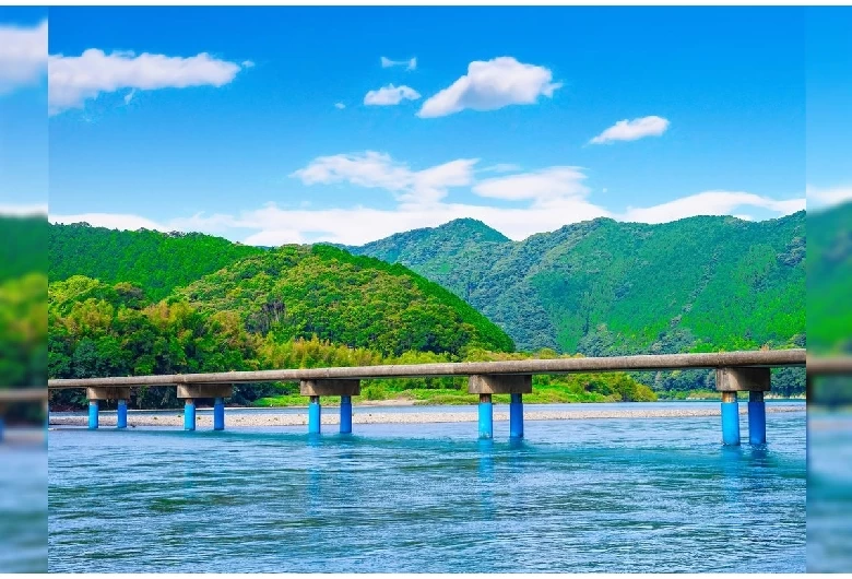 - ★ 高知県四万十川最下流に位置する佐田沈下橋(今成橋)は、全長291.6 m・幅4.2 mで沈下橋として川に沈む構造を持つ、本流で最も長い現役生活道です。青い橋脚が印象的で、地元でも観光客にも親しまれています。川と一体となる原風景の中で、ドライブやサイクリング、一息つくのにぴったりの場所です
