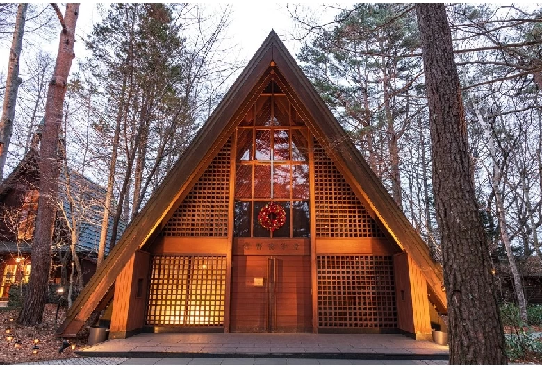 - ★ 1935年、英国人レオ・ウォード神父の願いにより創建された軽井沢唯一のカトリック教会。チェコ出身の建築家アントニン・レーモンドが手がけた三角屋根と尖塔が特徴で、木造の開放的な内部には高い天井と温もりある空間が広がります。文学では川端康成や堀辰雄の作品にも登場したスポットです