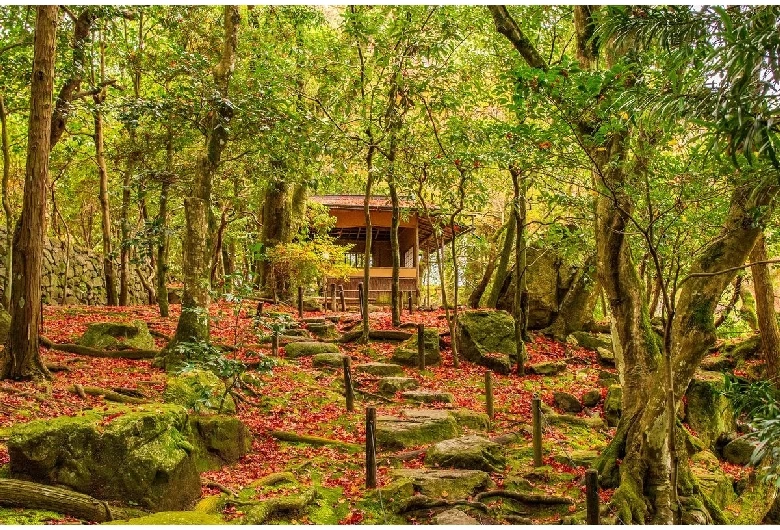 - ★ 里坊のひとつで、延暦寺のなかでも格式の高い寺院。3,300平方メートルの広さを誇る庭園は国指定の名勝で、大宮川の清流を取り入れた曲水を主体にし、八王子山を借景としています。秋には、青々とした苔と紅葉のコントラストを楽しむことができます