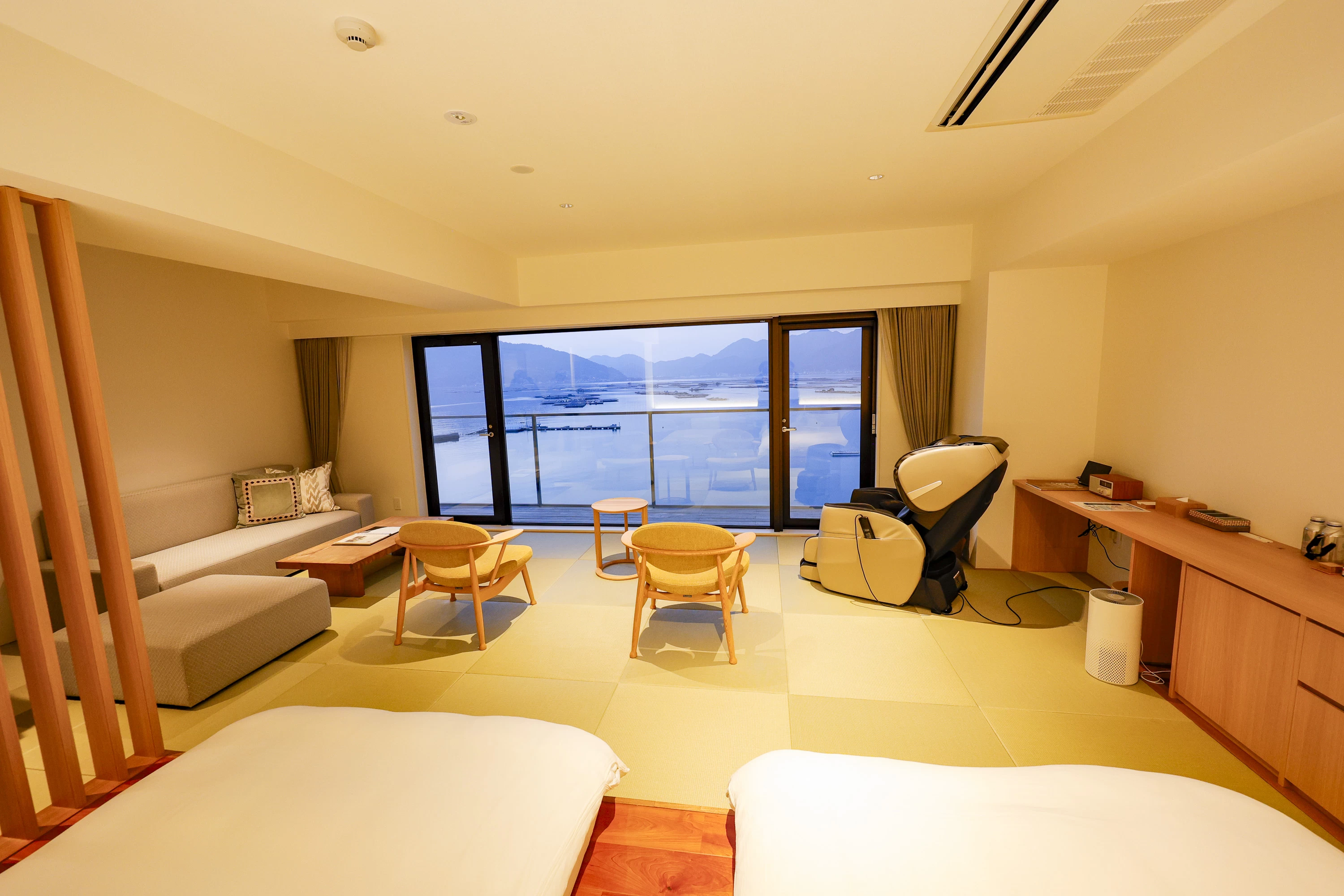 - ★ 「とにかくゆっくりリフレッシュしたい!」そんな時におすすめしたい宿。お部屋にはテレビが置かれていませんが、その替わり大きな窓が設置されているので、瀬戸内海をのんびり眺めるのがおすすめ。温泉は通常の温度と3度前後低温のぬるま湯があり、交互に浸かることで長く入ることができますよ。ロビーでは利き酒を自由に楽しめるようになっていて、お酒好きにはたまりませんよ。ゆったりリラックスして過ごすためのアイデアが、たくさん詰まったお宿です