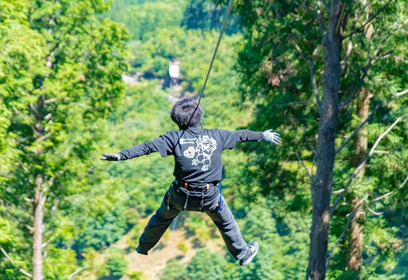 四国カルストのふもとに位置し、四万十川の源流点がある高知県・津野町の「フォレストアドベンチャー・高知」。地形を活かしたスリルと感動が味わえるアクティビティを用意しており、山から山へ空中移動するジップスライドでは、四季折々の絶景が眺められる。周辺には天狗高原や恋のパワースポット・長沢の滝があり、自然が満喫できるのも嬉しい。
