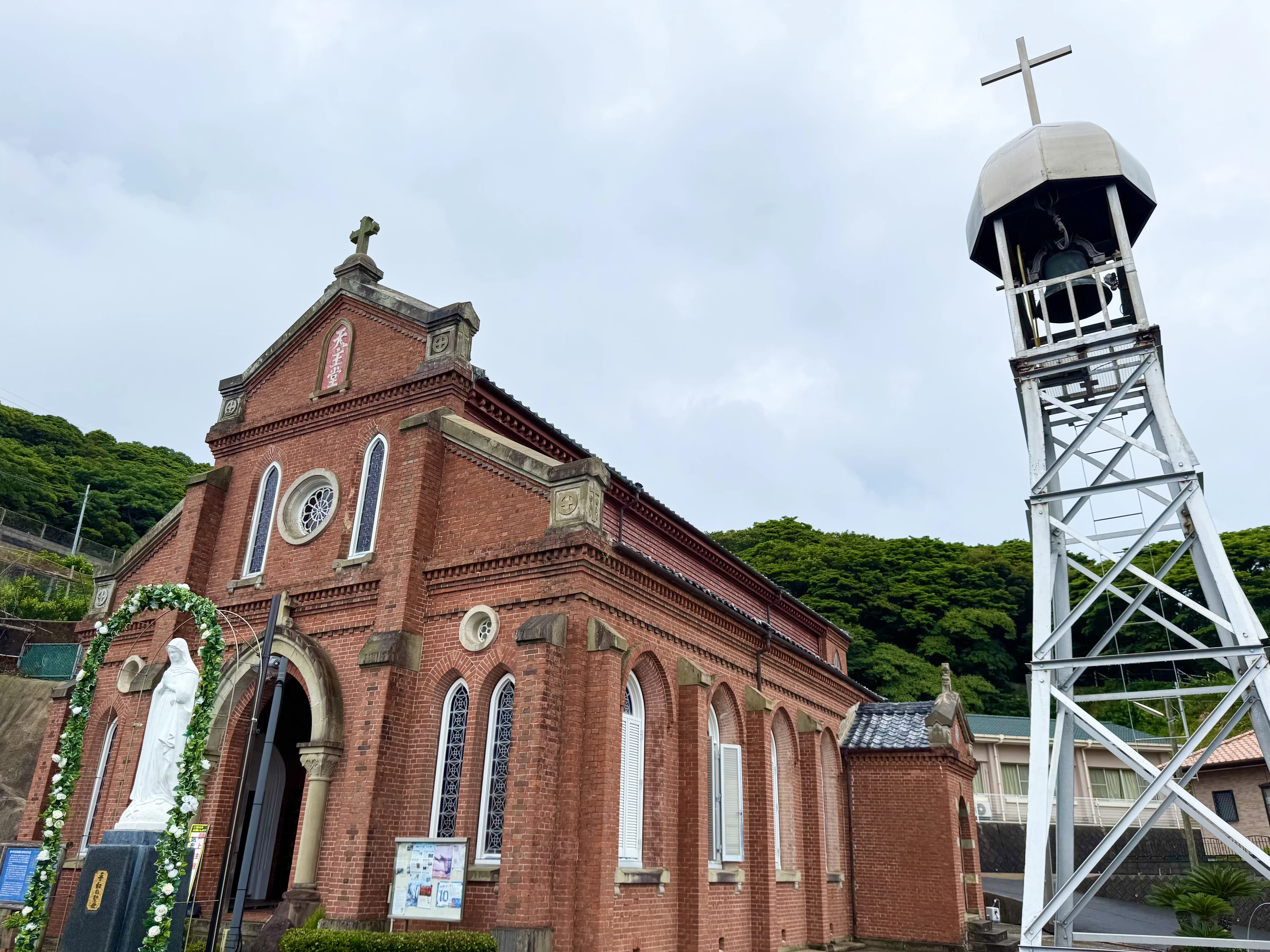 - ★ 赤レンガの外観の前には白いマリア像と緑のソテツが映え、印象的なコントラストに!